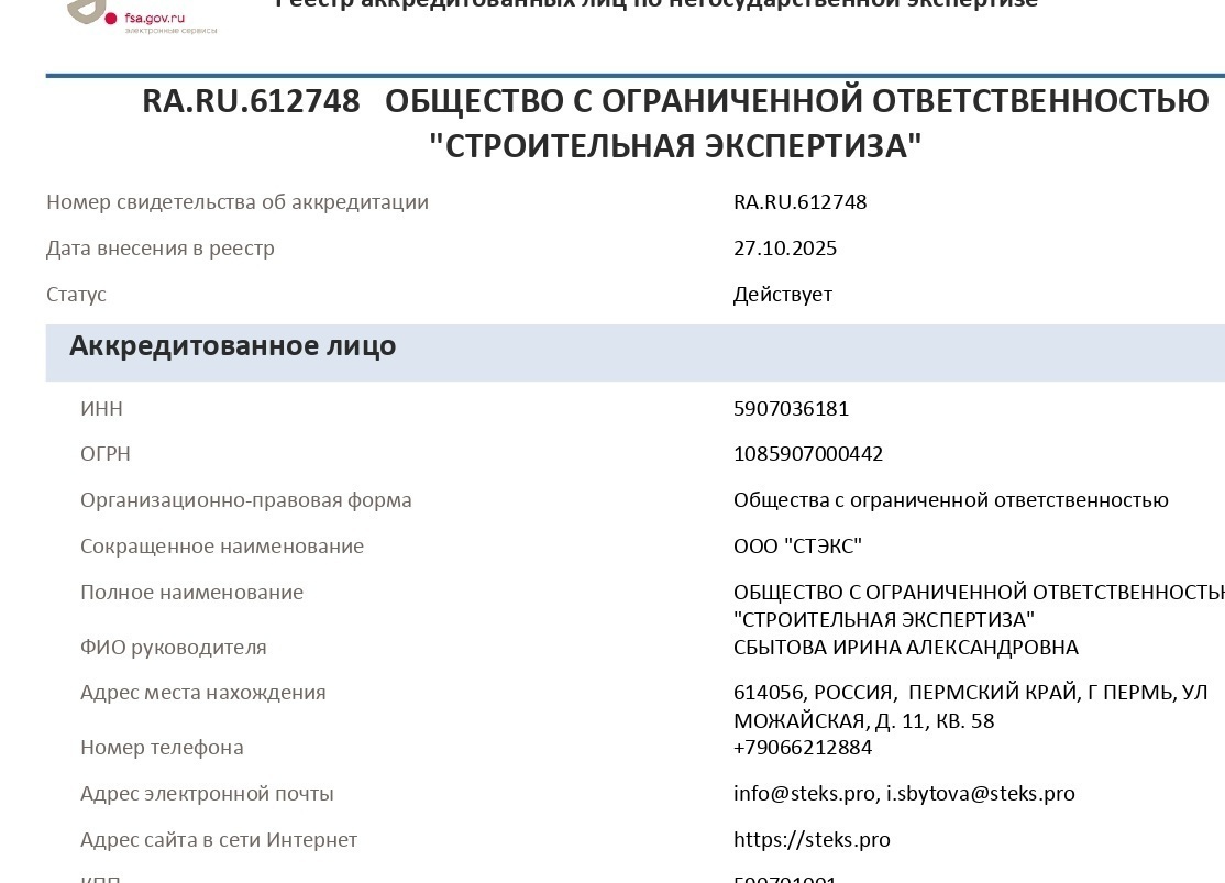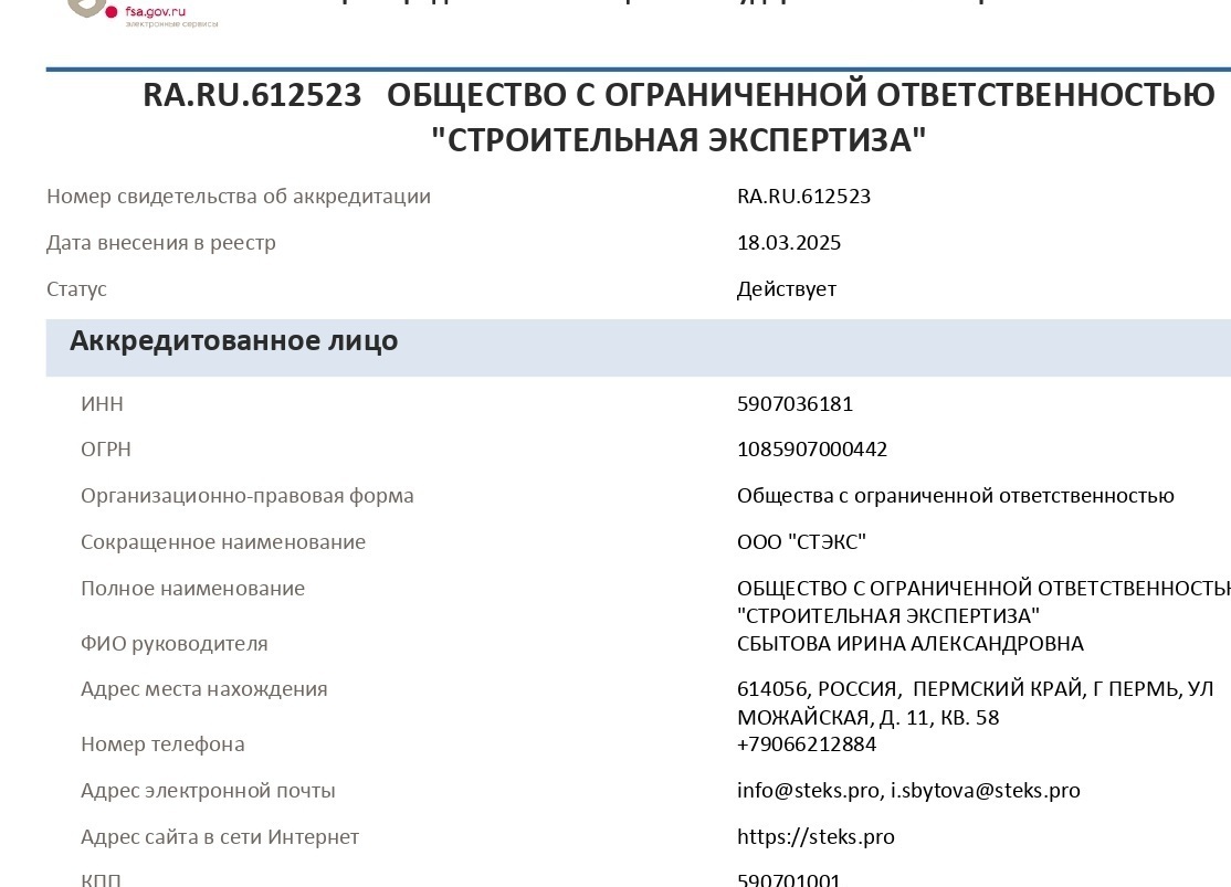 Строительная экспертиза аккредитована на поведение экспертизы как проектной документации, так и результатов инженерных изысканий. Специалисты включены в реестр лиц, аттестованных на право подготовки заключений экспертизы.