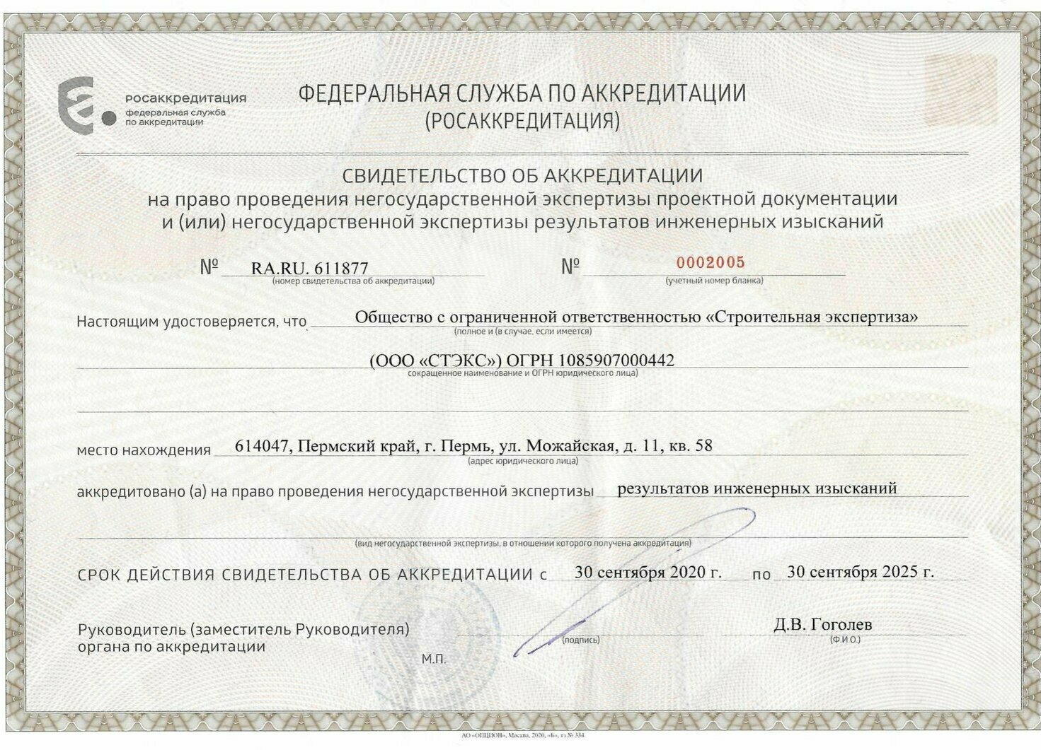 Свидетельство об аккредитации на право проведения негосударственной экспертизы результатов инженерных изысканий (30.09.2020-30.09.2025)